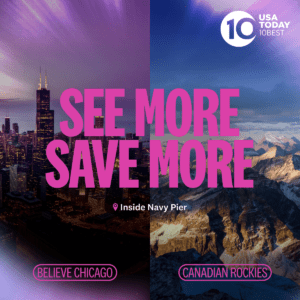 Visit one of Chicago’s best new attractions for an immersive experience you’ll never forget. Explore the urban landscape from a whole new perspective, allowing you to soar above and dive into the heart of this electric city with Believe Chicago. Then venture to the spirit of the Canadian Rockies. This alpine adventure transports you over iconic mountain scenery, from the legendary waters of Maligne Lake to the snowy heights of Mount Somervell with Call of the Canadian Rockies. Visit us at the Christkindlmarket Timber Tents on December 6-8 to win fun Flyover Prizes and a chance to win a free ticket! Let us be a part of your favorite holiday memories as you follow your sense of adventure.